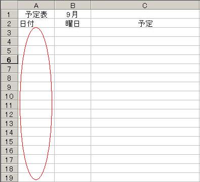 予定表、 9月、 日付、 曜日、、 と、テキスト(文字)を入力して、赤丸印の部分に1、2、3、〜と日付を入力してみます |