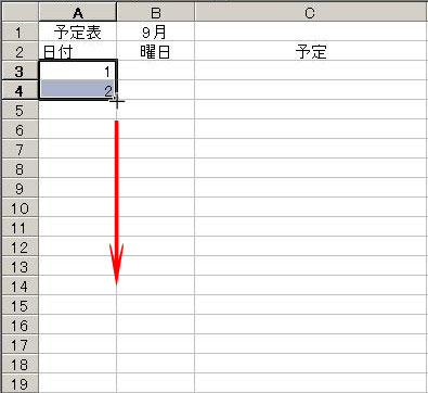 セルA3に 1 、 A4に 2 と入力して、2つのセルを選択します