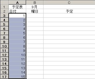 すると、1〜15までの日付(数値)が一瞬で入力されました、便利です! |