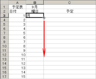 セルB3に 月 と入力して、選択セル右下のフィルハンドルをクリック状態でドラッグします |