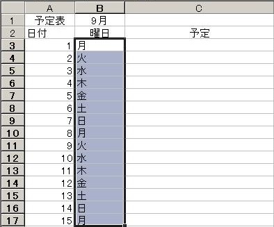 すると、すごいです!月、火、水、木、金、土、日、と、曜日が自動で入力されました
