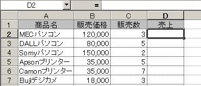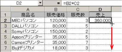 まず、MECパソコンの売上を、セルD2に表示するために計算式”=B2*C2”と入力します