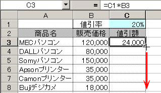 値引率のセルC1は移動せずに、固定で参照させないといけません