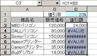 コレじゃまずいので、値引率が入力されたセルC1を固定して参照させないといけません