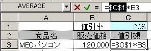 まず、MECパソコンの値引額を、セルC3に表示するために計算式”=C1*B3”と入力します