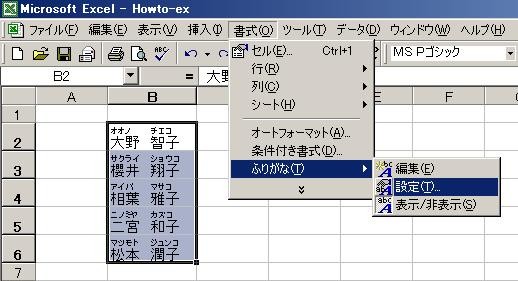 書式(O)→ふりがな(T)→設定(T)をクリックします
