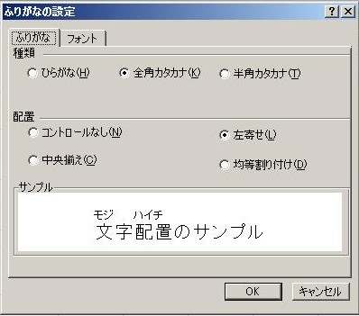”ふりがな”タブで、種類と配置を、