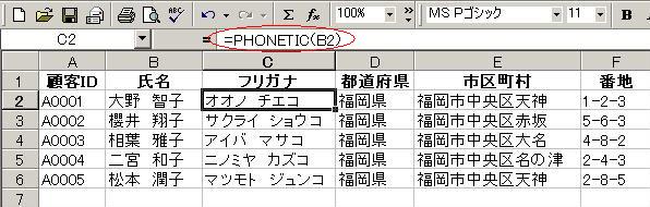 やっぱり、気になって仕方ないので、氏名の横にフリガナを表示させます まず、”氏名”と”都道府県”の間に列を挿入して、、フィールド名を”フリガナ”とし、 PHONETIC関数を使用します セルC2に、”=PHONETIC(B2)”と入力します そして、オートフィルで最終行までドラッグして、はい、終わり!!