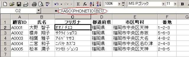 ついでにフリガナを全角から半角にしましょう ASC関数を使用します セルC2に、”=ASC(PHONETIC(B2))”と入力します そして、またまたオートフィルで最終行までドラッグして、はい、完成!!