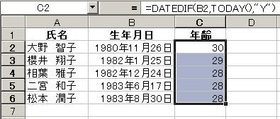 セルC2に”=DATEDIF(B2,TODAY(),"Y")”と入力されています