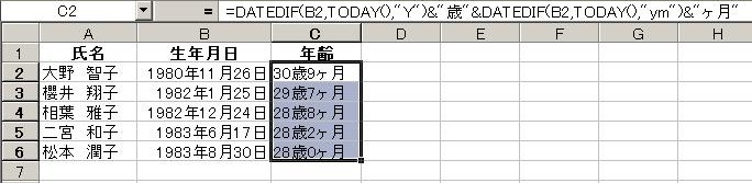 セルC2に”=DATEDIF(B2,TODAY(),"Y")&"歳"&DATEDIF(B2,TODAY(),"ym")&"ヶ月"”と入力されています