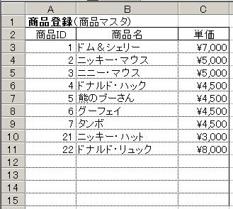 同じブック内の別シートに”商品マスタ”を作って、そこから商品名を呼び出して見ましょう