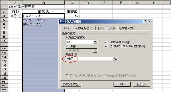 設定画面の”入力値の種類(A)”で”リスト”を選択し、”元の値(S)”に、”=商品”と入力します