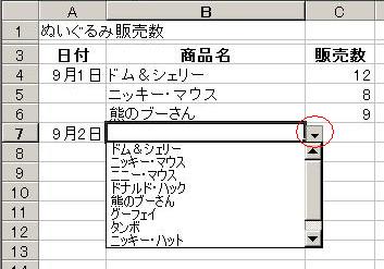 ここをクリックし、入力するデータ(値)を選んでください、商品マスタに登録している商品がリストアップされています