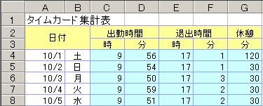 時 と 分 を別々のセルに入力する事で、「:」コロンを使わなくてもいいようにしました