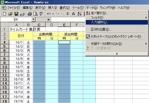 メニューバーより、データ(D)→入力規制(L)をクリックします