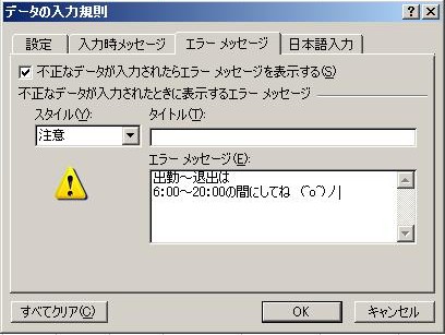 エラーメッセージ(E)・・・出勤〜退出は6:00〜20:00の間にしてね (^o^)丿