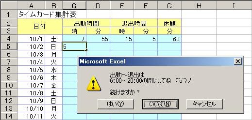 次に、入力規制範囲外の 5時 を入力してみると、エラーメッセージが出て教えてくれます