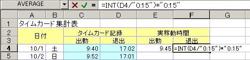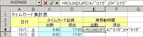 まずは、出勤時間から、ROUNDUP関数を使用します