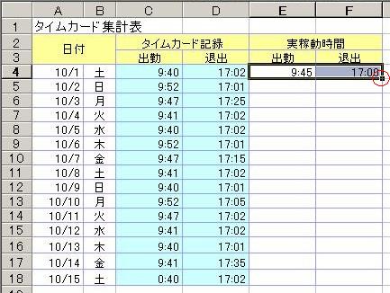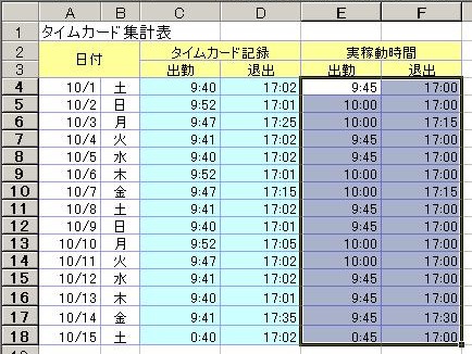 タイムカードに刻印されている実際の時間がライトブルーのセルに入力されています