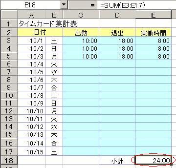 数式バーの計算式を見て頂くと分かるように セルE18には、セルE3〜E17までの合計が算出されるようになっています 本当なら、 24:00 となるはずが 0:00 となっています これは、時刻は24時になったら0時に戻るという事からこのように表示されます 時刻でなく、時間としてして表示するには書式を設定してあげる必要があります