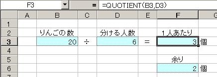 こんなときは、 QUOTIENT関数とMOD関数を使います この関数がやってくれるお仕事は、 QUOTIENT(数値,除数)…割り算の余り(小数点以下)を切り捨てる MOD(数値,除数)…割り算の余りを出す と、いう事ですのでこの問題にぴったりです、早速使ってみましょう セルF3に =QUOTIENT(B3,D3) と入力されています セルF6に =MOD(B3,D3) と入力されています