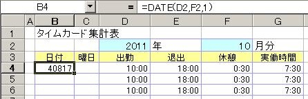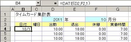 まず、日付入力欄1番上に DATE関数を使って2011年10月1日を表示します
