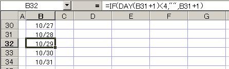 10/31が表示される部分には→ =IF(DAY(B31+3)<4,"",B31+3)