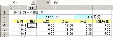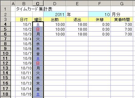 これは、タイムカード集計表です。月が変わるごとに毎回日付を入力しないといけません